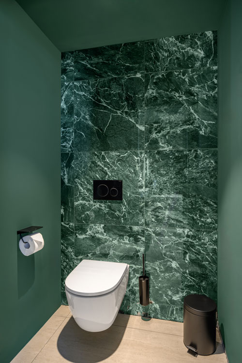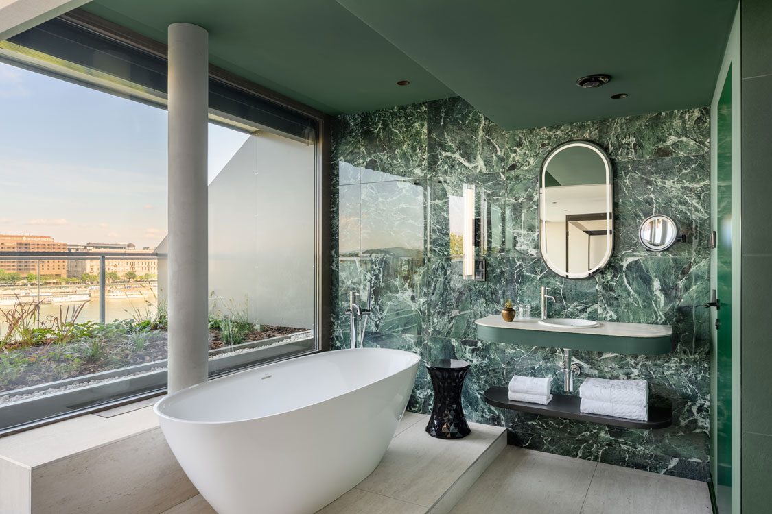 The Hotel Leon features 48 uniquely designed rooms and studios that reflect a harmonious blend of comfort, style, and artistic flair — some offering views of the river or the Buda Castle. The construction was overseen by Market Építő ZRT, well-known for high-level real estate development for the private and commercial sector. The site has a renowned past as a former palace and stable, and certain architectural features still remain, including centuries-old stone walls. Leather chairs and sofas in black and brown, contemporary lighting, stone, glass and metal are some key design elements within the overall design of the hotel. This modern style carries over into the bathrooms, where bold colours such as emerald green or terracotta combine with marble walls, white ceramics and matt black details. Several Roca collections, including Ona and Victoria, complemented the hotel’s style, and ensured comfort and accessibility.