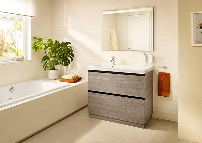 If you prefer a more modern option, the elegance of ash is present in the Natura structure units or in the Heima solutions, to be combined with an endless array of basins. There is also the Lander collection and its floorstanding rustic furniture units that can opt for the City Oak finish, also available in the Savana countertops, with damp-proof and water-resistant wood.