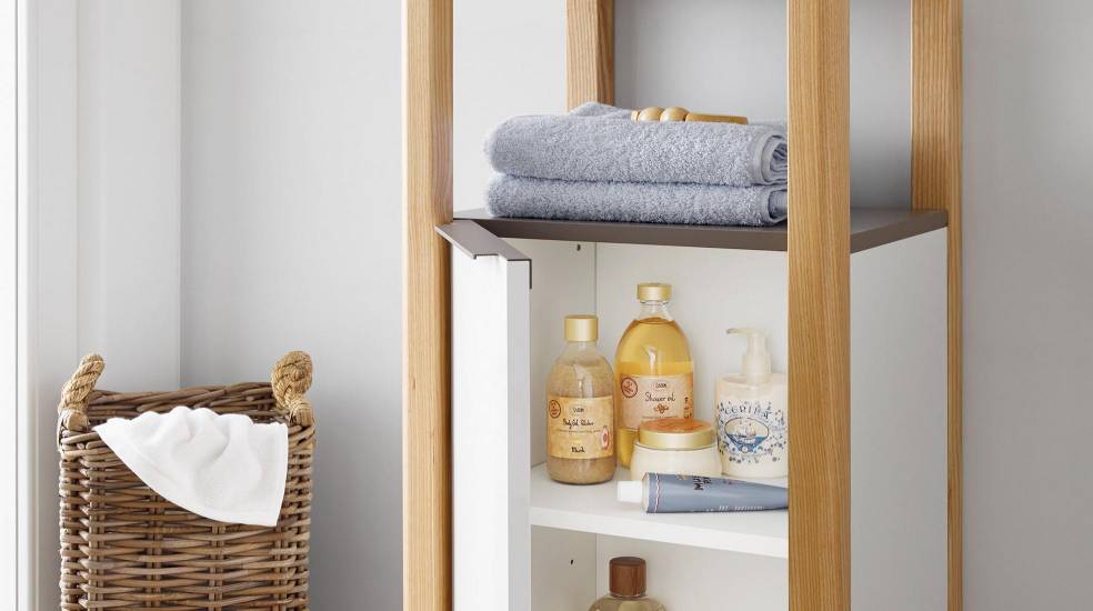 The Natura collection allows you to store even more exposed content in an auxiliary bathroom unit: a column unit that combines three exposed white shelves, height-adjustable, with a closed compartment.
