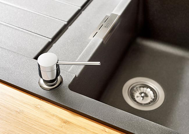 If what you treasure the most in a kitchen sink is its functionality, you can install one single bowl or combine it with a second one or a colander. Increase the possibilities of your kitchen sink by rounding it out with a Syra kitchen faucet and its practical retractable spout. And in order to have everything close at hand, don’t hesitate to add a built-in soap dispenser to your quartz sink to obtain a perfectly integrated ensemble.