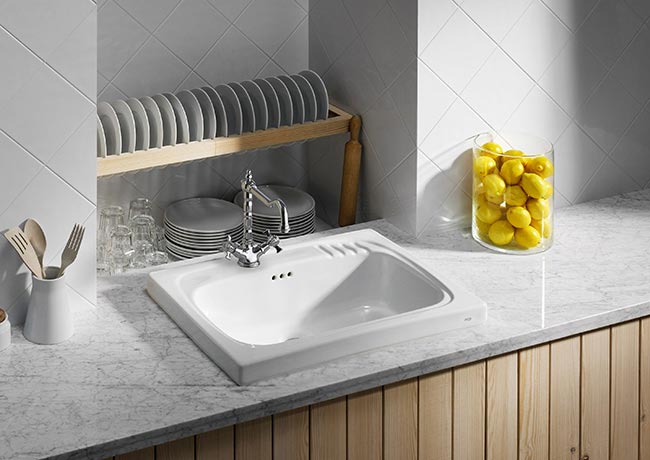 Make the most of the retro inspiration of these vintage kitchen sinks that will perfectly match the Victorian outline of the Carmen kitchen faucets. Choose one or two bowls, or one bowl with colander and opt for a metallic basket or a chopping board with a natural wood texture to provide the perfect finishing touch.