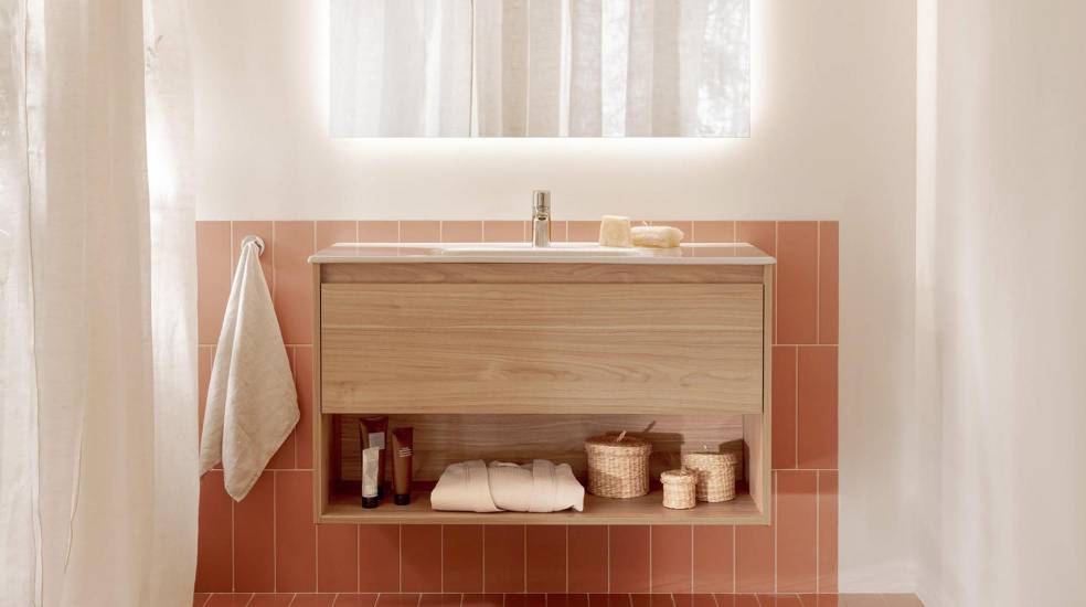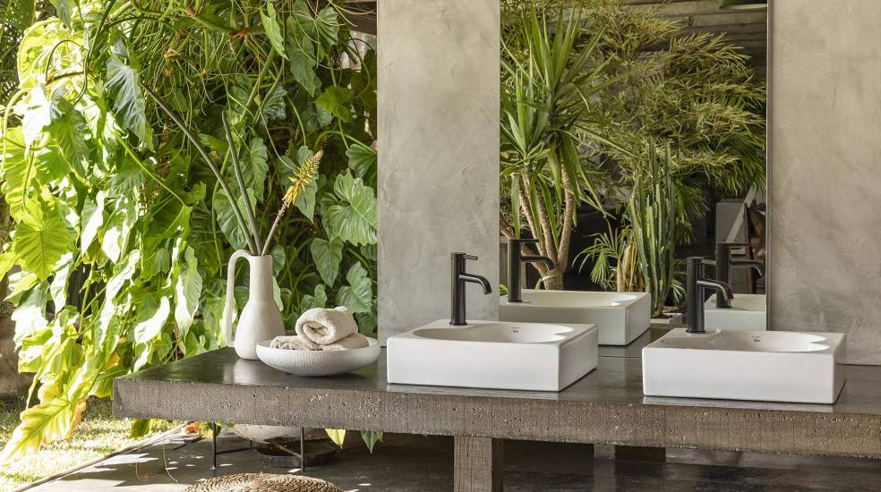 Tura’s light terracotta furniture and cork, wood and fabric accessories, create welcoming spaces. The elegant and minimalist design of the Hotels collection conveys a sense of serenity, while the variety of finishes of the Cala faucets creates a harmonious contrast with the fruity colours of this tropical trend.