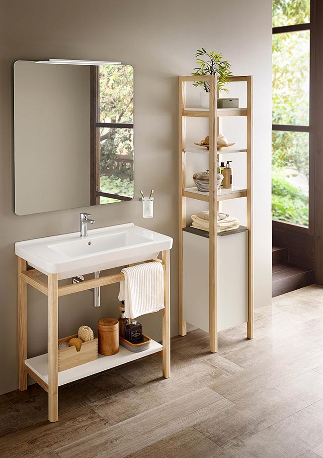 Evocative and warm, natural wood furniture units add personality to any space. In open and unobstructed interiors, opt for the Savana countertop in City Oak to make your basin stand out as the theme of your interior design. And if your home is defined by minimalism, install a Natura base unit with basin, an open structure with a Nordic style that combines white color and natural wood.
