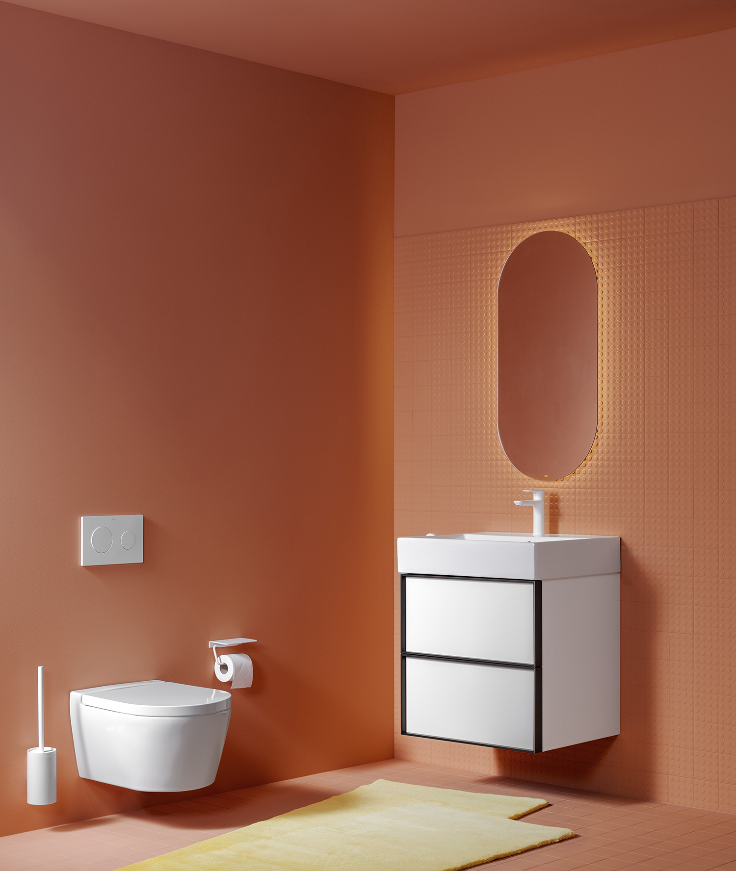 The Ona Pack includes a compact base unit with one door, basin and LED Eidos mirror