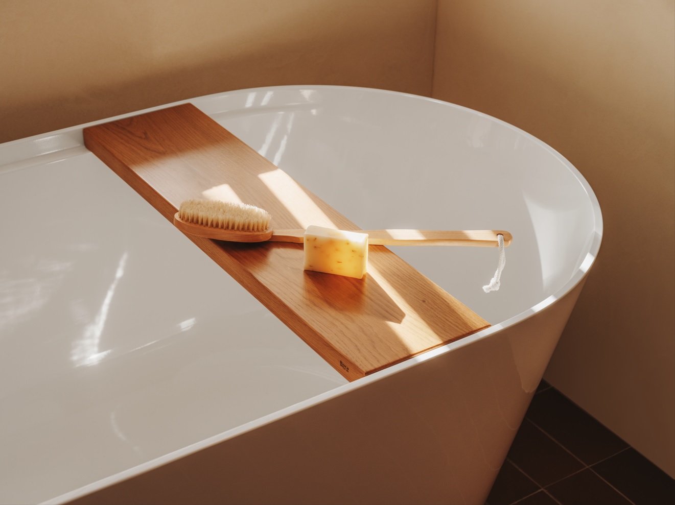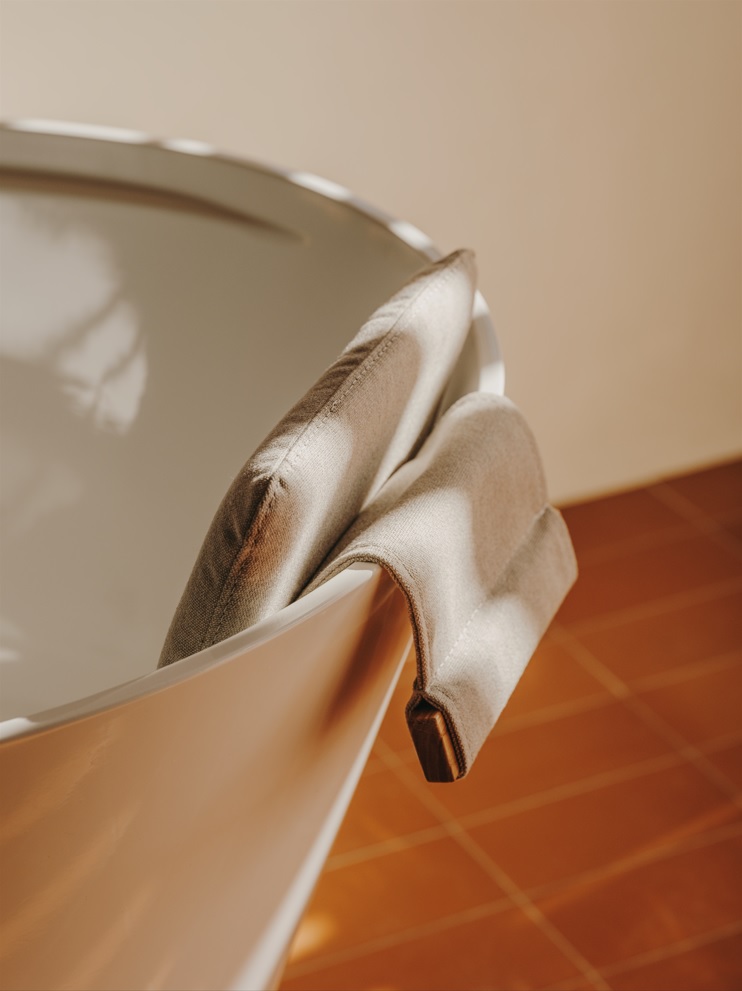 The Tura bathtub is at once voluminous and light, and its ergonomic design is meant for rest and relaxation. Its unique stacking shape is inspired by an architectural cantilever system, giving the impression that the bathtub is floating in space. It is made with Stonex®, an innovative material that allows for very precise shapes along with thin and linear forms that made it possible to create a subtle edge along the rim of the bath to hold the wooden shelf in place.