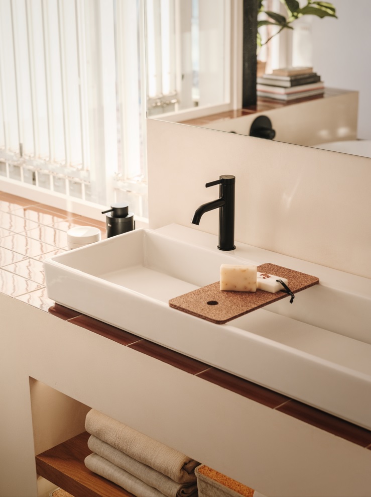The felt storage boxes are lightweight, sustainably made and available in two different sizes. Their recycled cork lid can serve as a shelf on top of the washbasins.