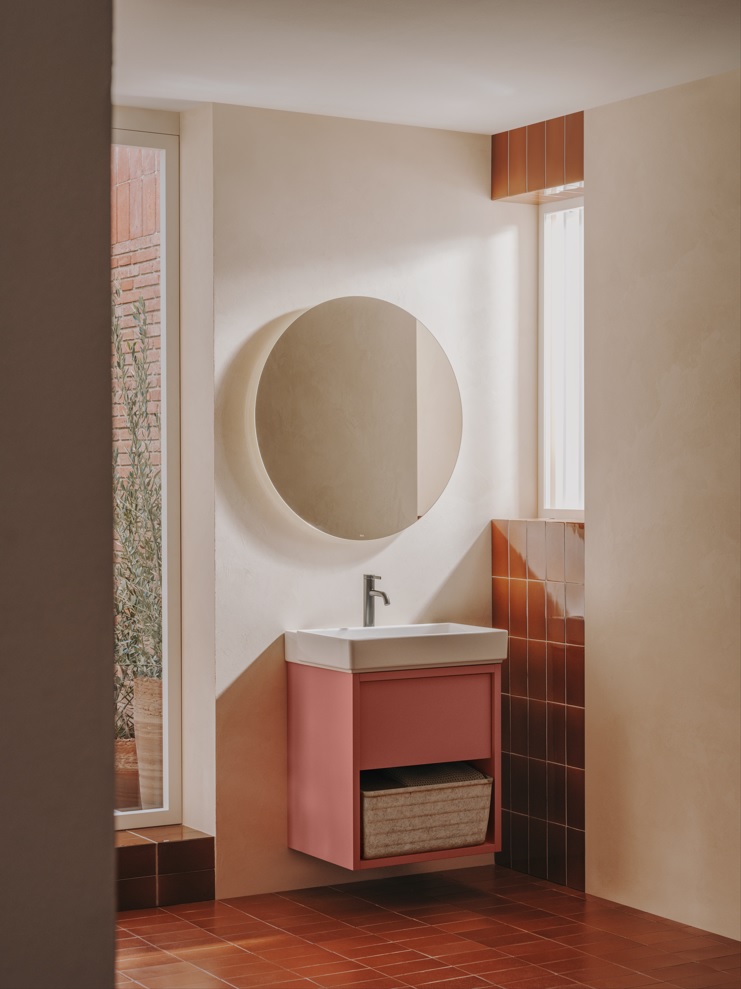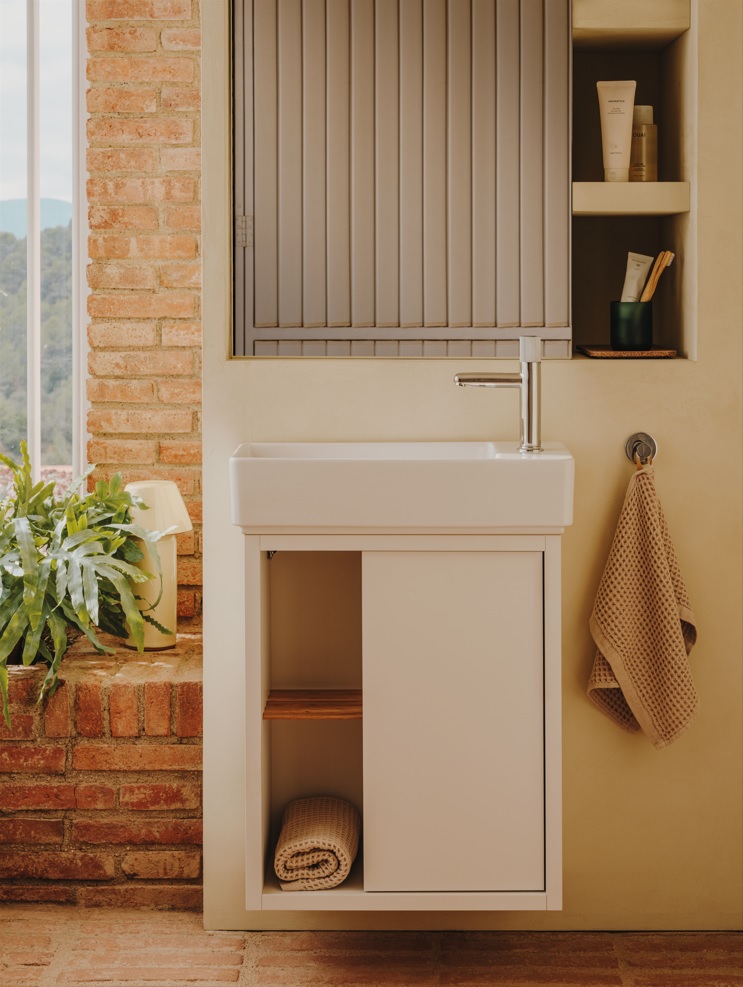 Tura’s furniture is an example of architectural synthesis, as they integrate seamlessly with the washbasins. Designed using straight lines, empty spaces and very simple shapes, the collection features three finishes: off-white, light noble grey and light terracotta, which like the other two, is equally subtle and natural.